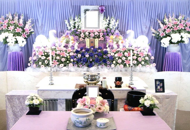 お花の祭壇は、故人様をのお好きだった紫とピンクのお色で作成しました。